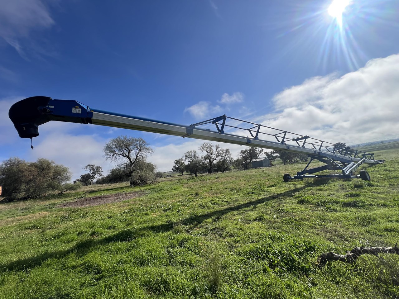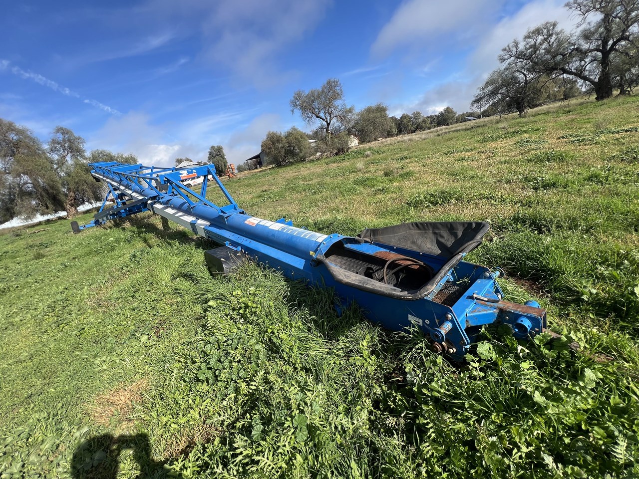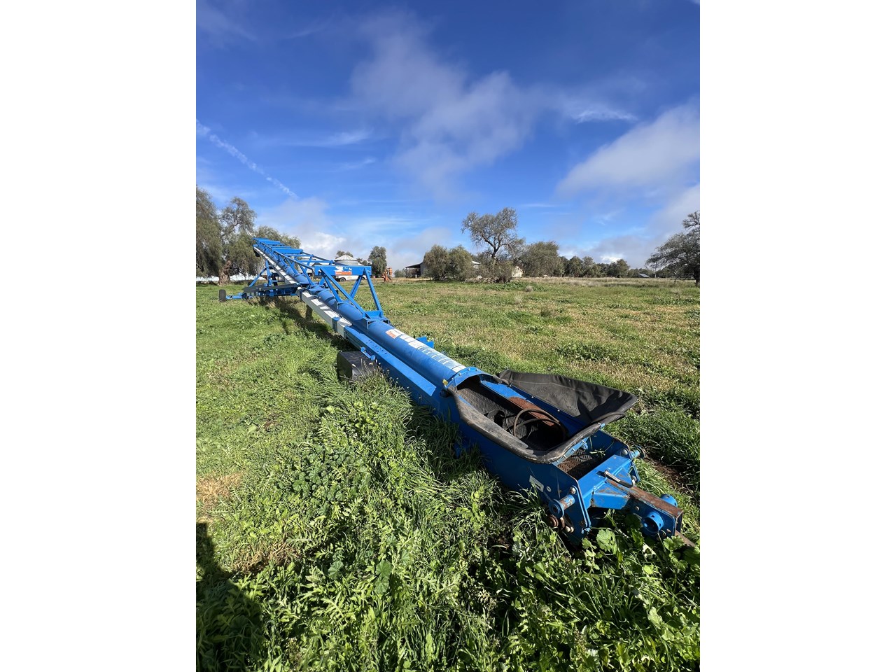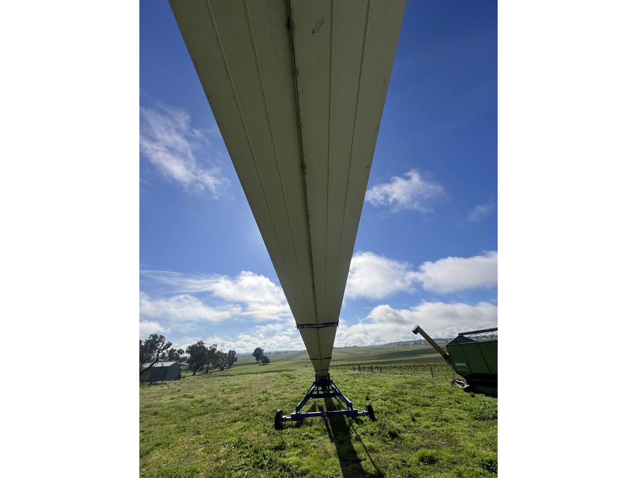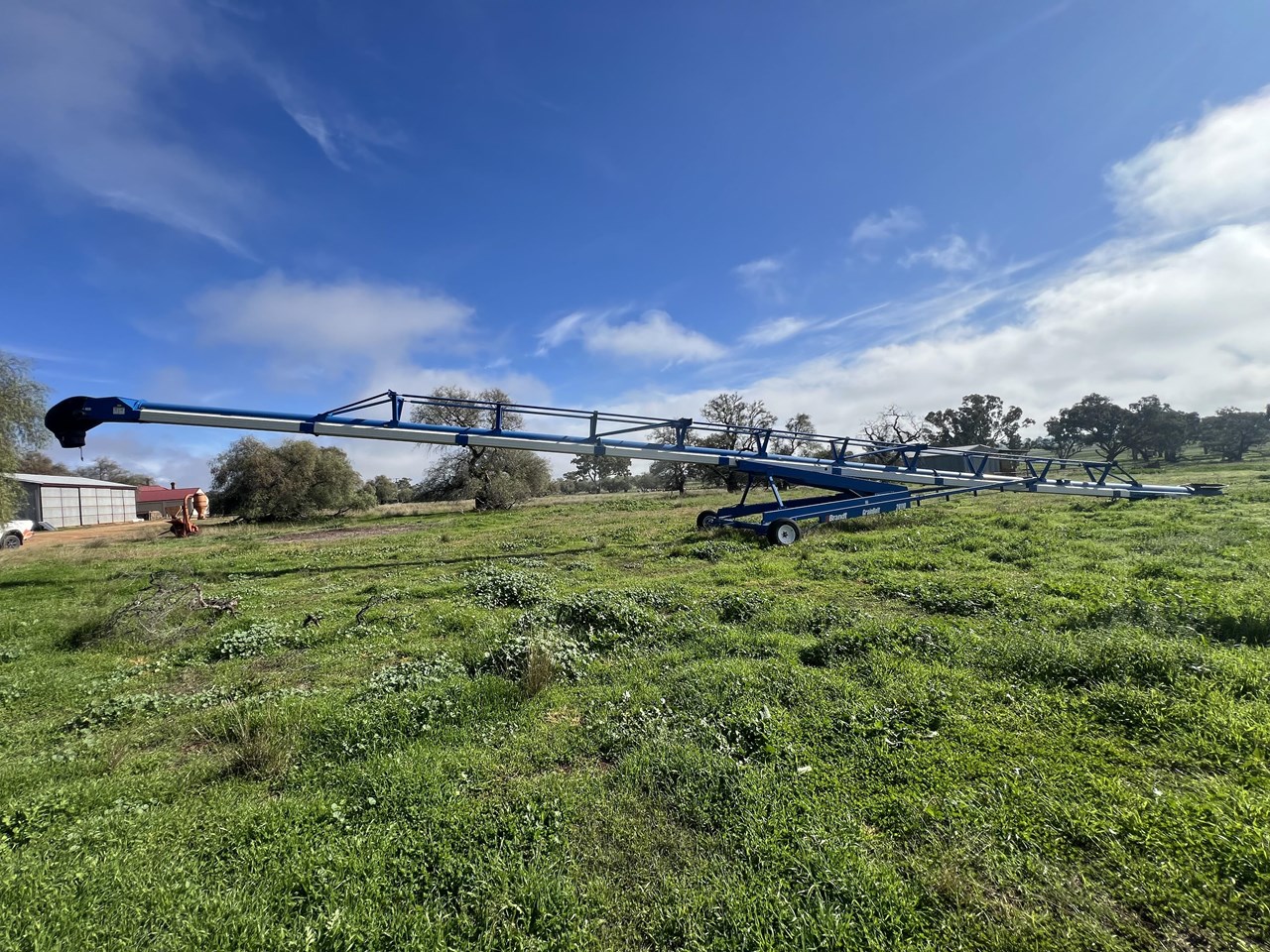 Client bought this unit in 2021, used if for that season and has not used it since. The belt is in good order. all bearings and adjustment arms are also in good order, one tyre is stuffed the other is ok. There is some minor damage on the support arm near tyres as per picture but nothing detrimental to the unit. Big Capacity Conveyor at a good price. with a big reach and large TPH this unit will suit a larger grower and a grain facility looking to increase capacity and efficiency.