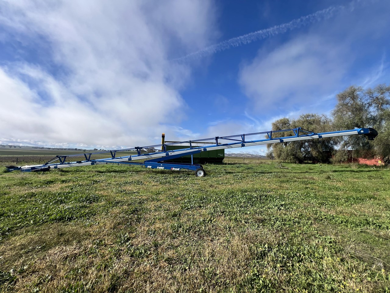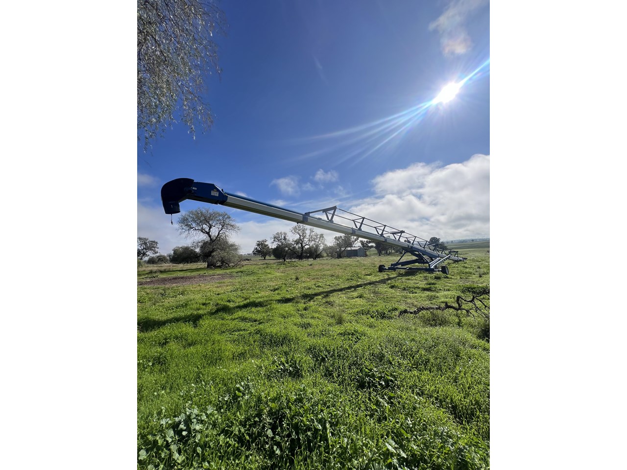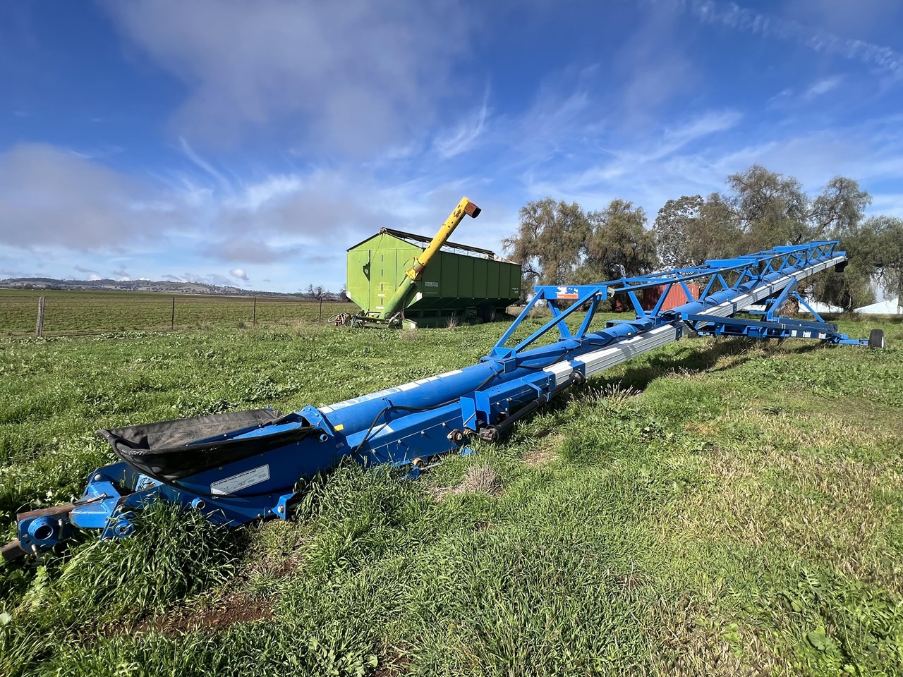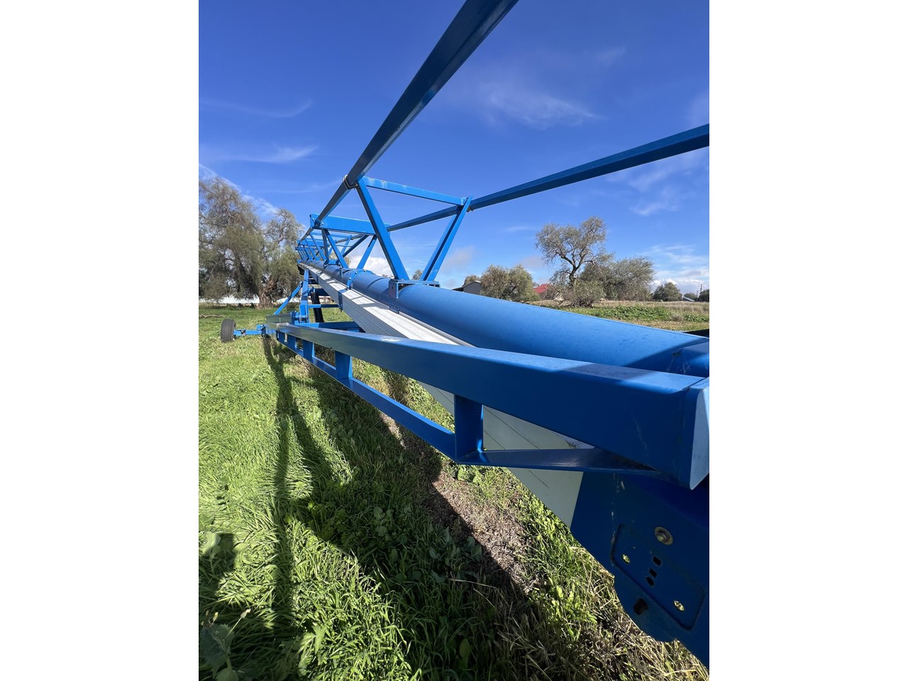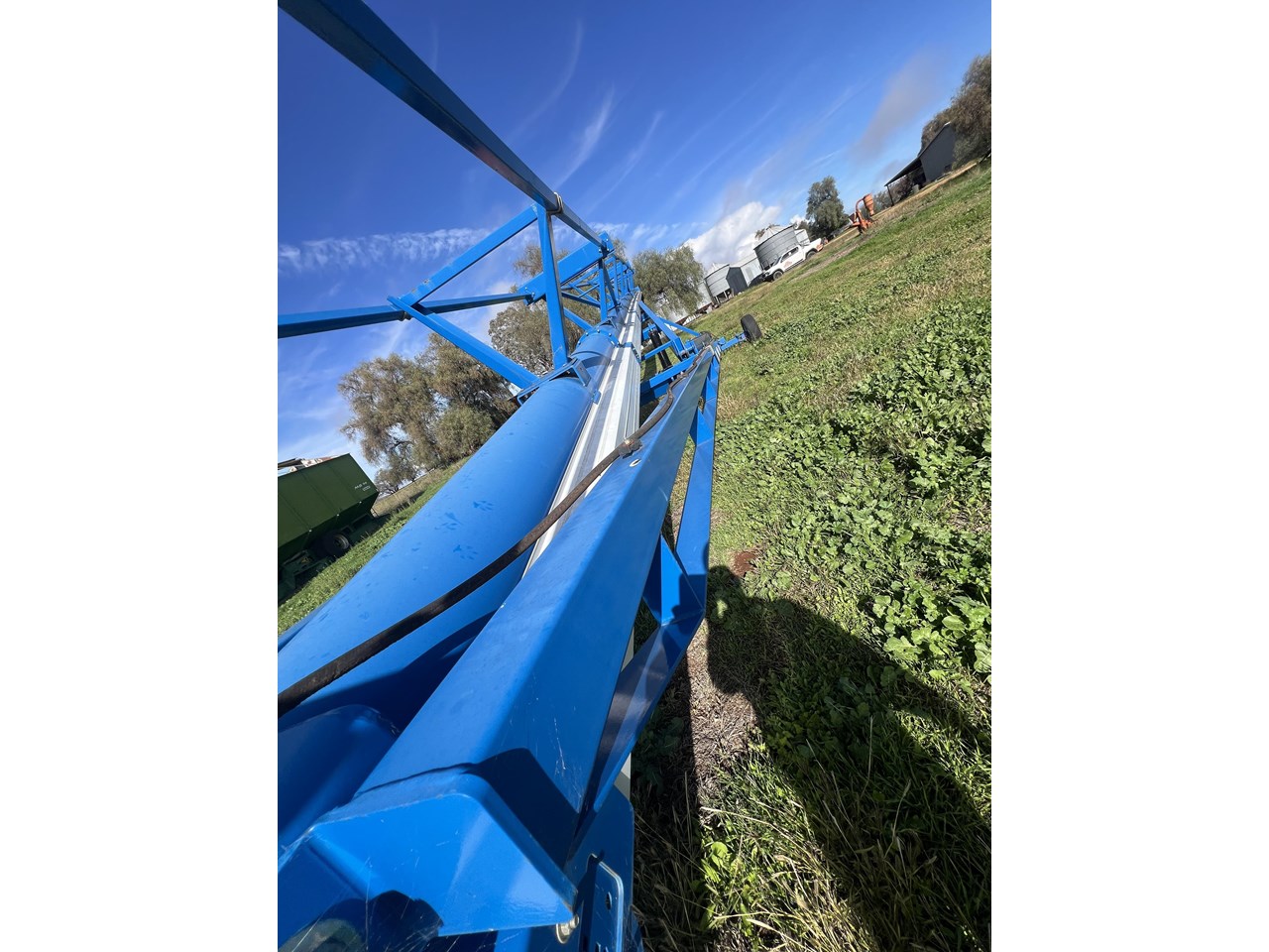 Client bought this unit in 2021, used if for that season and has not used it since. The belt is in good order. all bearings and adjustment arms are also in good order, one tyre is stuffed the other is ok. There is some minor damage on the support arm near tyres as per picture but nothing detrimental to the unit. Big Capacity Conveyor at a good price. with a big reach and large TPH this unit will suit a larger grower and a grain facility looking to increase capacity and efficiency.