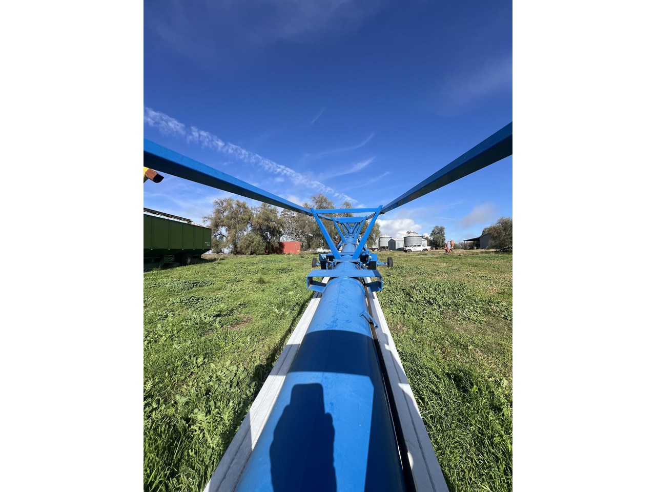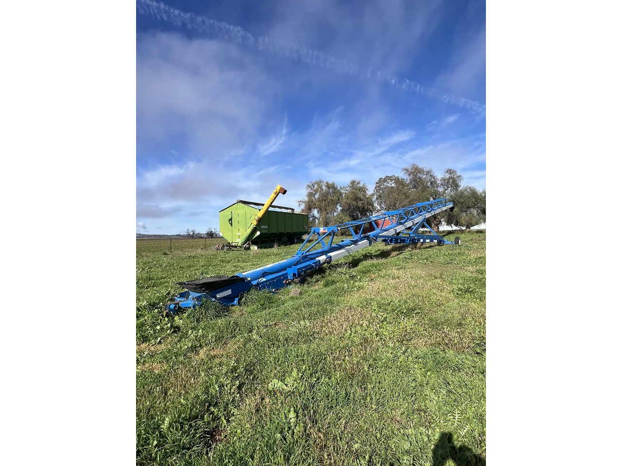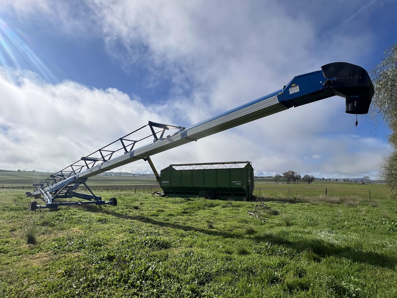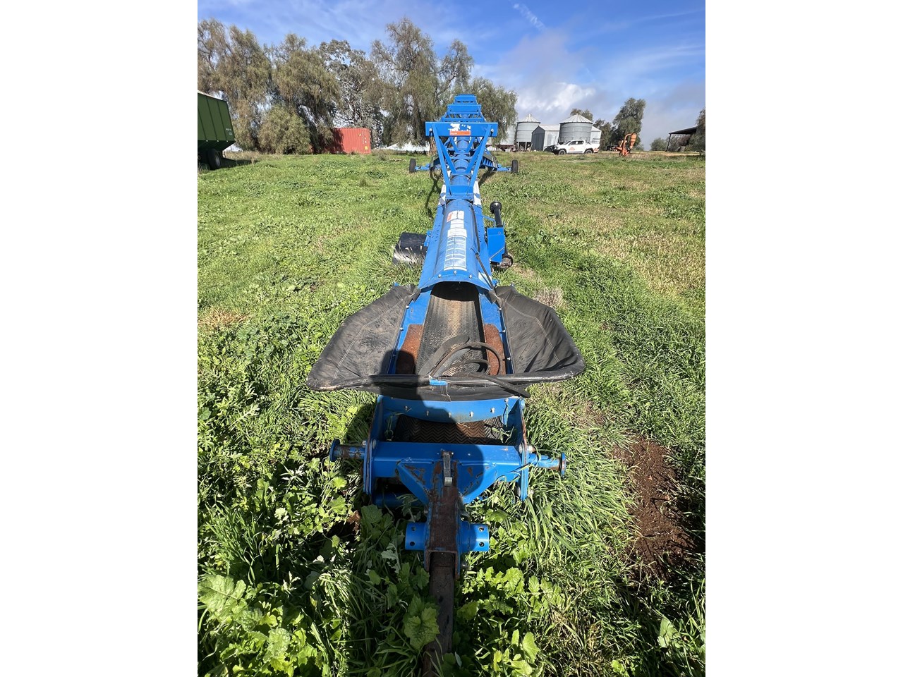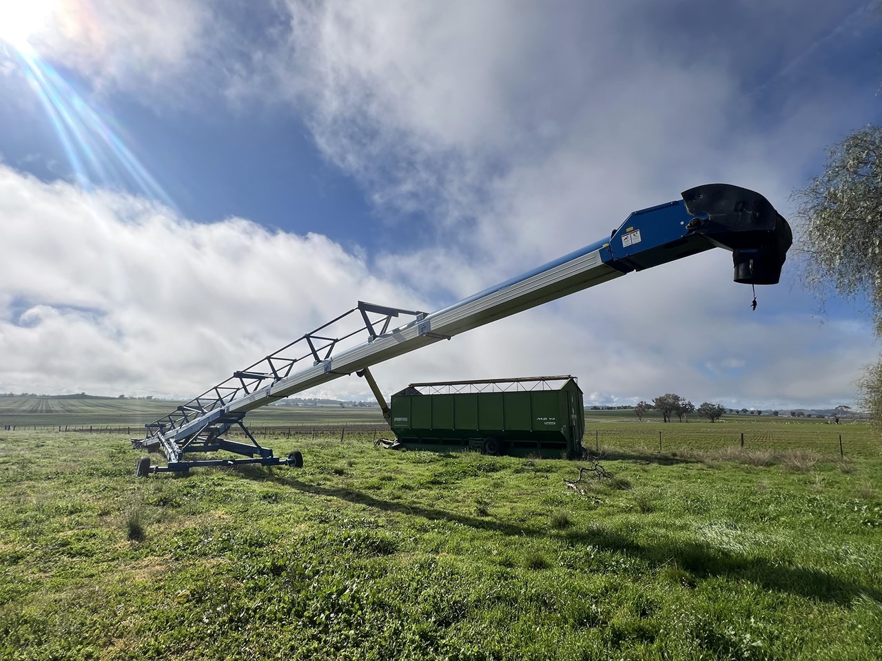 Client bought this unit in 2021, used if for that season and has not used it since. The belt is in good order. all bearings and adjustment arms are also in good order, one tyre is stuffed the other is ok. There is some minor damage on the support arm near tyres as per picture but nothing detrimental to the unit. Big Capacity Conveyor at a good price. with a big reach and large TPH this unit will suit a larger grower and a grain facility looking to increase capacity and efficiency.