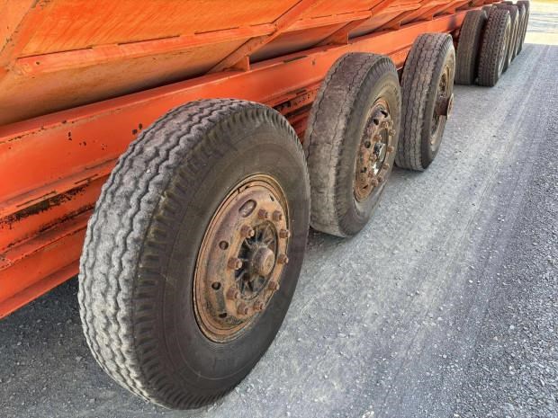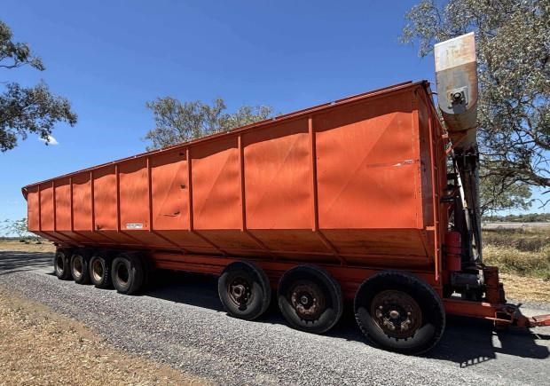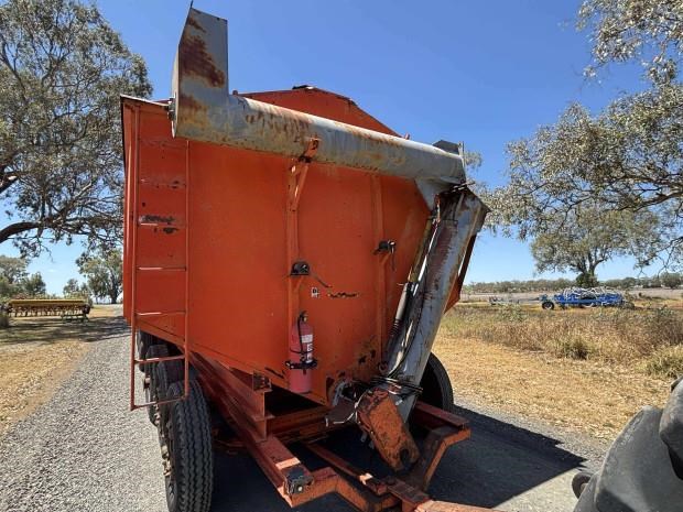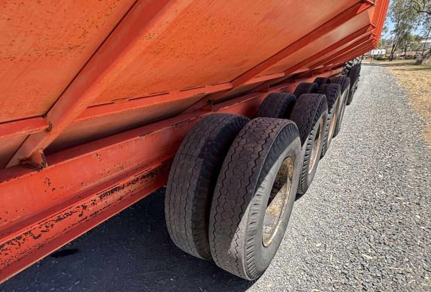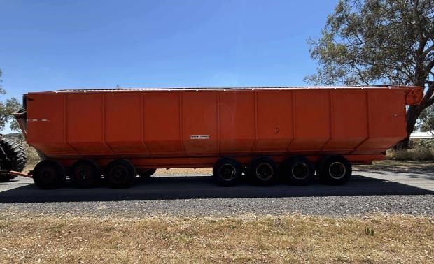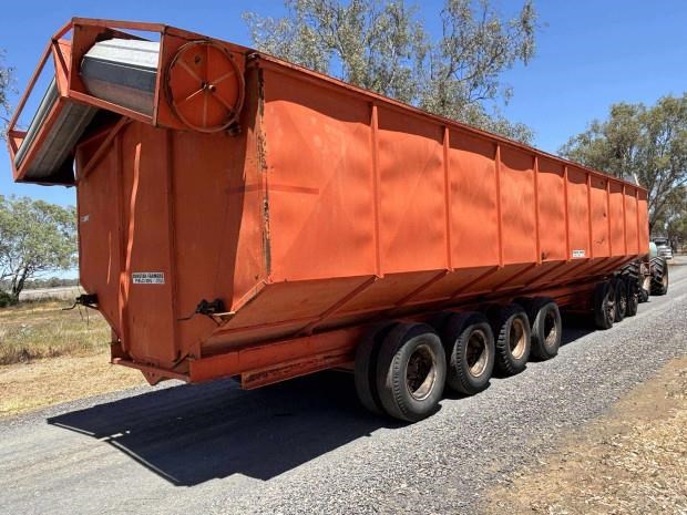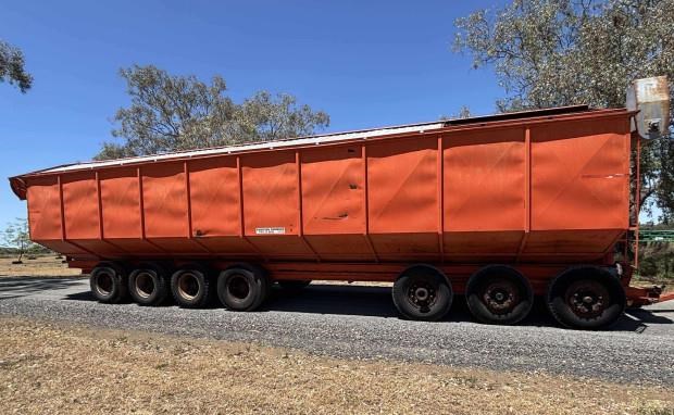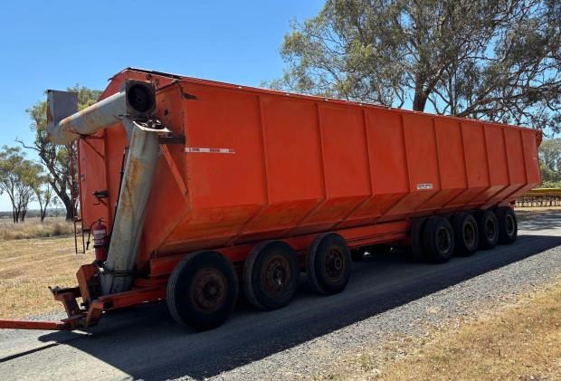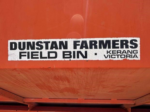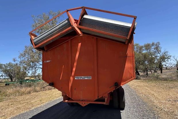 Dunstan Mother Bin, trailing, 75 tonne, 97m3 capacity, roll on steel bin covers, 7 axle, hydraulic fold unload auger, PTO drive, good condition, near Toowoomba QLD, includes GST