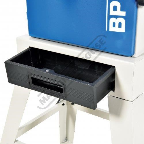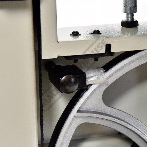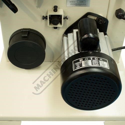 The dust extraction port located at rear of machine will remove most of your internal dust once connect to your dust extractor; and whatever the extractor does not collect the removable tray built into the stand will collect the rest. The 2-speed pulley system rotates at 400 or 800m/min and his driven by a nicely matched 375W / 0.5hp 240V motor