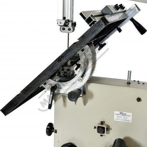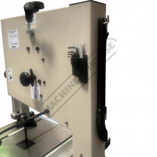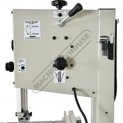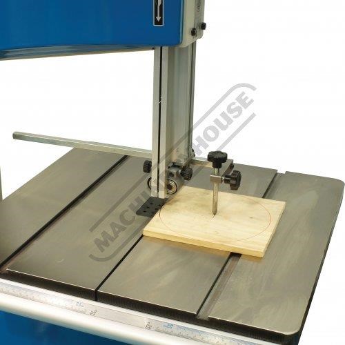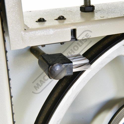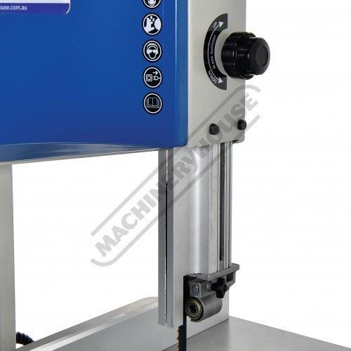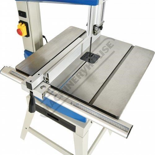 This bandsaw has a welded steel frame designed to keep your machine from twisting whilst cutting at 340 x 225mm capacity. It has a generously 545 x 515mm cast iron table with an aluminium rip fence and mitre guide to help you cut straight or angles to the required size. The table mounting trunnions are adjustable to get your tale to tilt from 90 to 45 degrees and has a quick action locking lever. This machine also has its own LED light that is mounted to a flexible arm so the light can be adjusted direct on the cutting line no matter what timber size you are cutting.