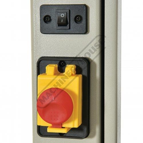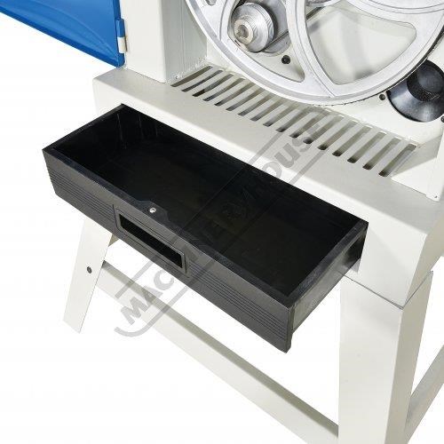 The dust extraction port located at rear of machine will remove most of your internal dust once connect to your dust extractor; and whatever the extractor does not collect the removable tray built into the stand will collect the rest. The 2-speed pulley system rotates at 370 or 800m/min and his driven by a nicely matched 1100W / 1.5hp 240V motor