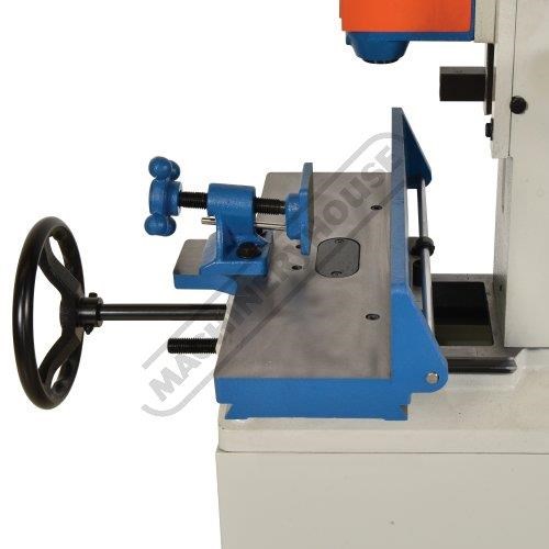 This heavy-duty chisel morticer handles up to 25mm in softwood, featuring a cast iron frame and a fabricated steel stand. A single handwheel controls both longitudinal and lateral table movements, eliminating table ``skewing,`` a common issue in other models. The material clamp adjusts for various workpiece widths, while the multi-position down-feed lever ensures comfortable operation with optimal leverage.
