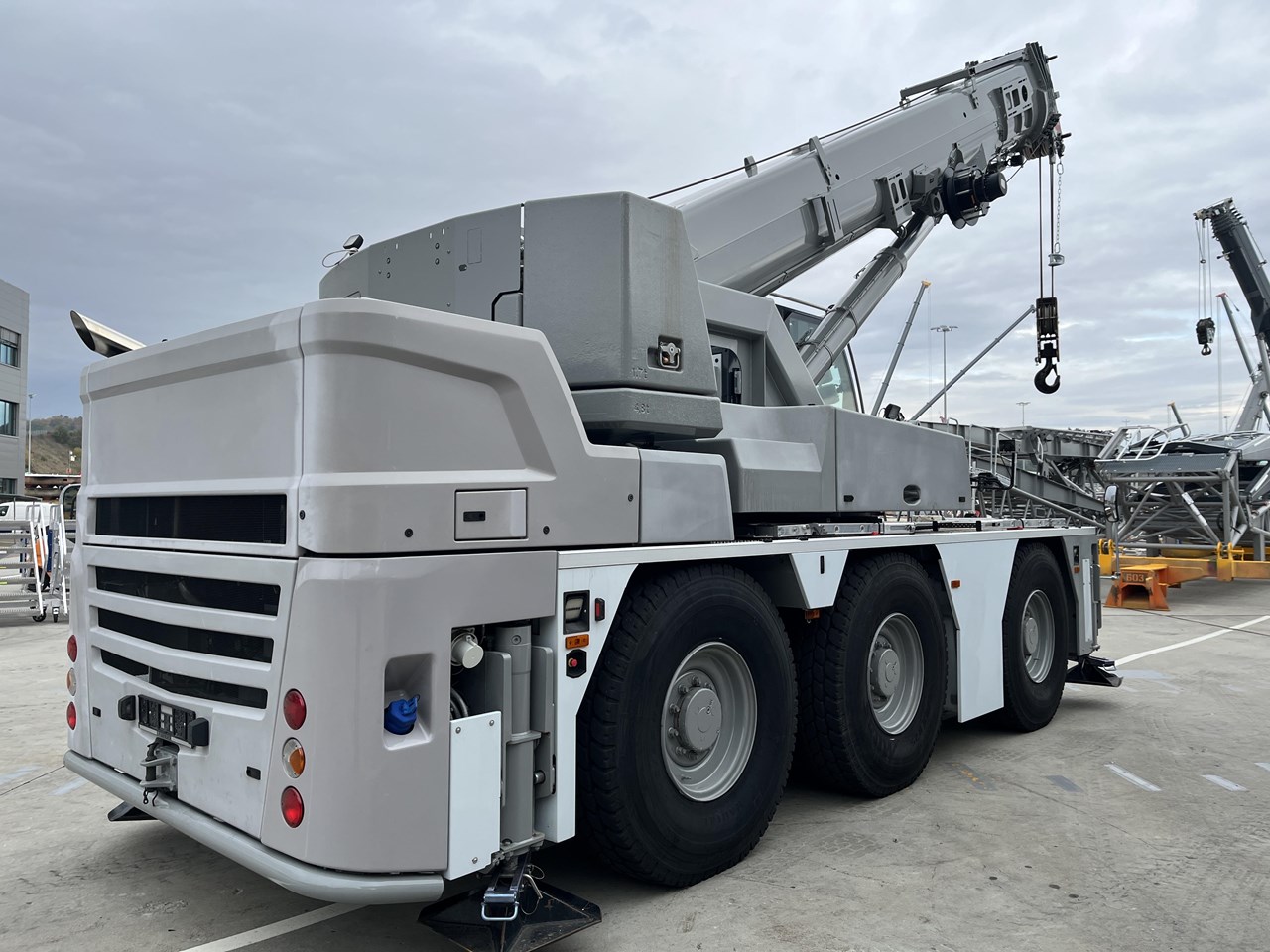 Additional Accessories: 12 V-socket in crane cabin, lighting package superstructure: two working floodlights at pivot section (electrically adjustable) and floodlights at the turntable (2 x laterally and 1 x rear), remote control including remote drive, two-part ballast (4,8 t + 1,8 t = 6,5 t), telematics telescopic boom.