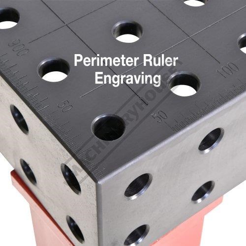 The Metalmaster M16 Pro Series welding tables features a welded & ribbed construction from heavy S355 plate steel, the frame is then CNC machined with the sides & top having a finished nominal thickness of 12mm. The CNC machining process is able to achieve a high flatness tolerance of +/- 0.1mm over 1m2 to give you a smooth precision welding surface. During this CNC machining process, the Ø16mm holes are precision bored to ensure a hole distance tolerance of +/- 0.05mm & with an industry standard 50 x 50mm hole pattern it gives you a multitude of fixture holes to suit your application. Before removing the table from the machining centre, we engrave 50mm grid lines & perimeter ruler to give you millimetre precision helping you minimise mistakes while increasing productivity.