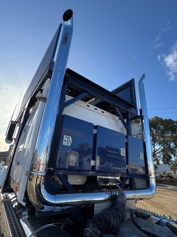 Custom cab frame with toolboxes and dual exhausts