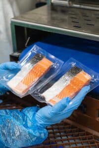 This packaging machine packs over 50 units a minute, mainly for retail supermarket sites. Packaging fresh seafood within minutes of it being cut ensures the freshness is sealed in for the duration of its time on any retail display. As packaging for retail channels relies on high speed, this system enables the business to process large volumes efficiently while maintaining product integrity.